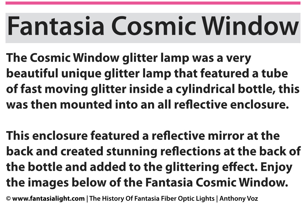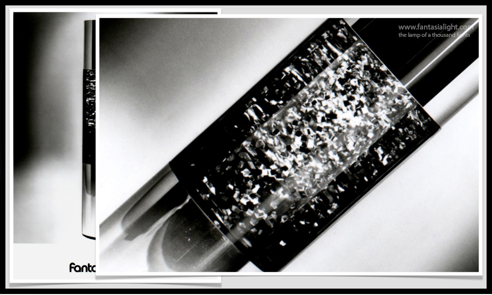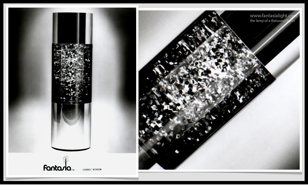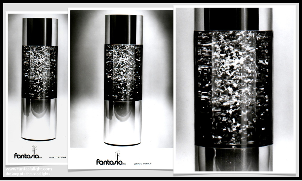 Fantasia created three generations of glitter lamps. The Cosmic Window lamp was a very beautiful unique glitter lamp that featured a tube of fast moving glitter inside a cylindrical bottle, this was then mounted into an all reflective enclosure. This enclosure featured a reflective mirror at the back and created stunning reflections at the back of the bottle and excentuated the glittering effect.