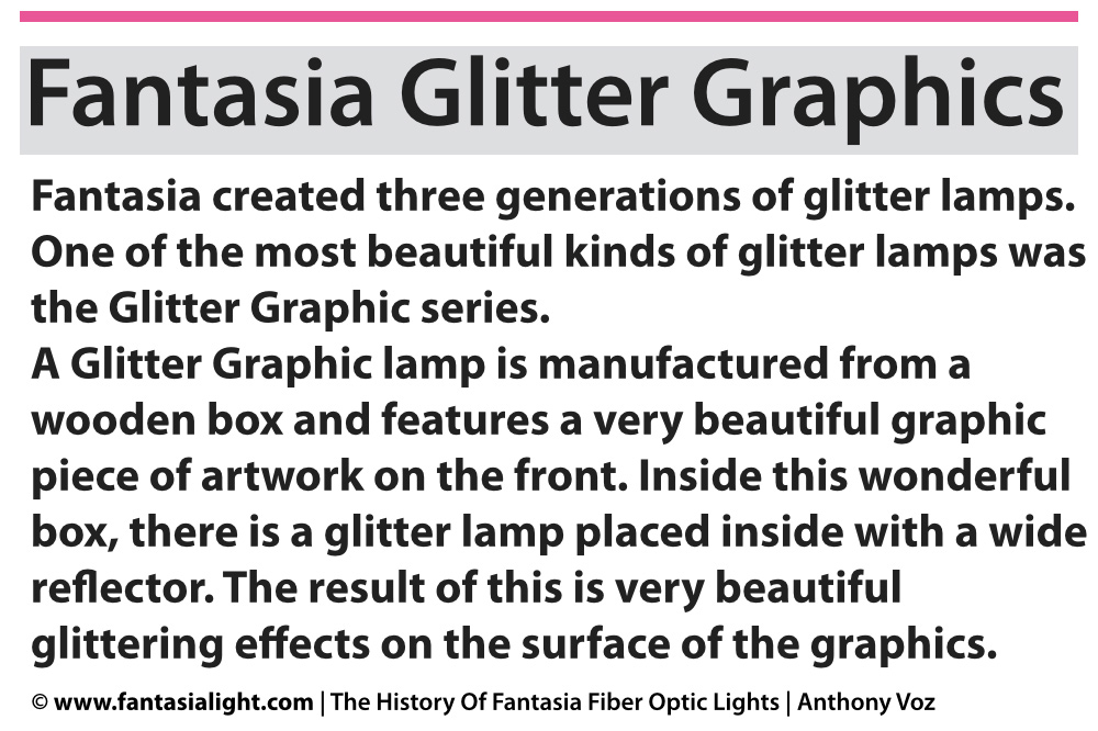 Fantasia's Glitter Graphic Series. Please see images below. Fantasia created three generations of glitter lamps. One of the most beautiful kinds of glitter lamps was the Glitter Graphic series. A Glitter Graphic lamp is manufactured from a wooden box and features a very beautiful graphic piece of artwork on the front. Inside this wonderful box, there is a glitter lamp placed inside with a wide reflector. The result of this is very beautiful glittering effects on the surface of the graphics.