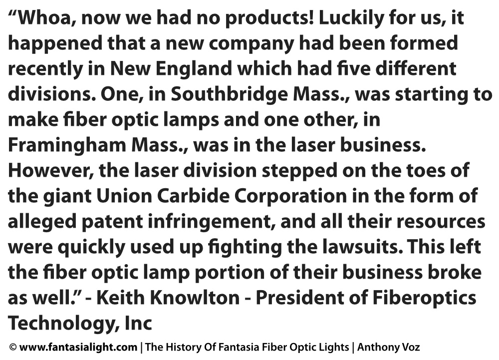 Whoa, now we had no products! Luckily for us, it happened that a new company had been formed recently in New England which had five different divisions. One, in Southbridge Mass., was starting to make fiber optic lamps and one other, in Framingham Mass., was in the laser business. However, the laser division stepped on the toes of the giant Union Carbide Corporation in the form of alleged patent infringement, and all their resources were quickly used up fighting the lawsuits. This left the fiberoptic lamp portion of their business broke as well.