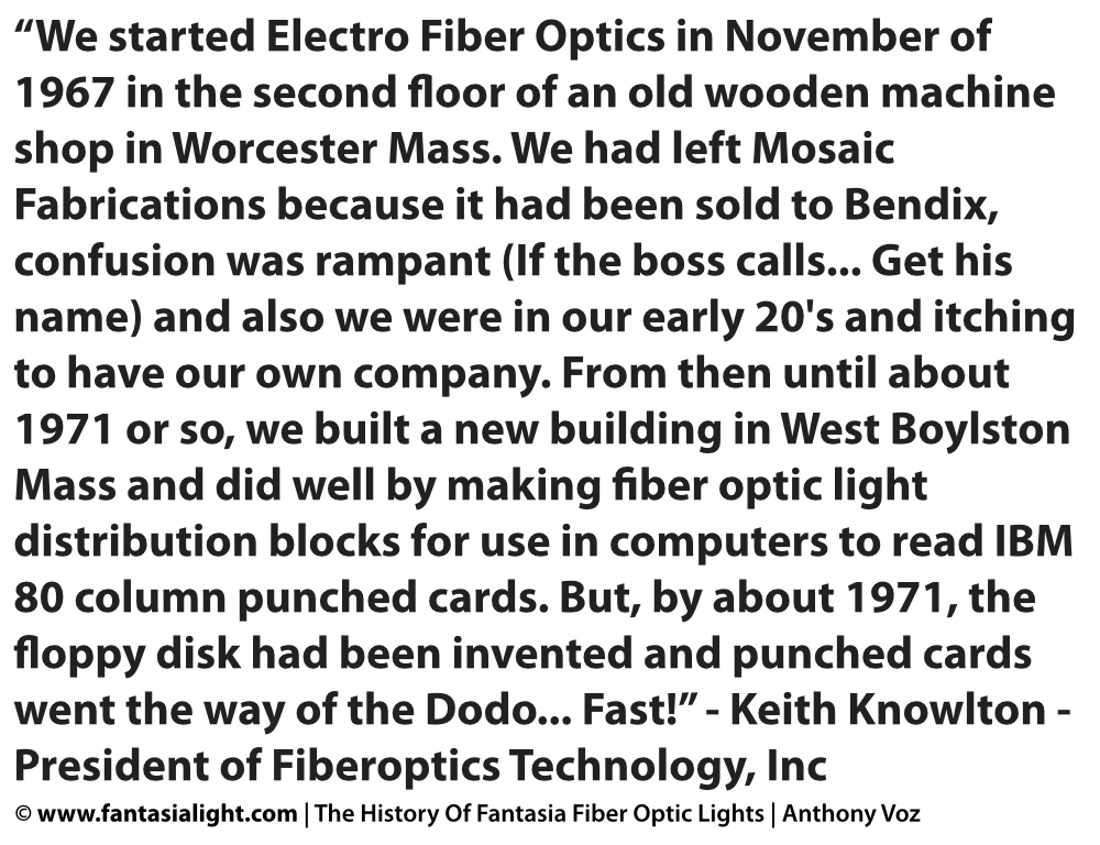 We started Electro Fiber Optics in November of 1967 in the second floor of an old wooden machine shop in Worcester Mass. We had left Mosaic Fabrications because it had been sold to Bendix, confusion was rampant (If the boss calls... Get his name) and also we were in our early 20's and itching to have our own company. From then until about 1971 or so, we built a new building in West Boylston Mass and did well by making fiber optic light distribution blocks for use in computers to read IBM 80 column punched cards. But, by about 1971, the floppy disk had been invented and punched cards went the way of the Dodo... Fast!
